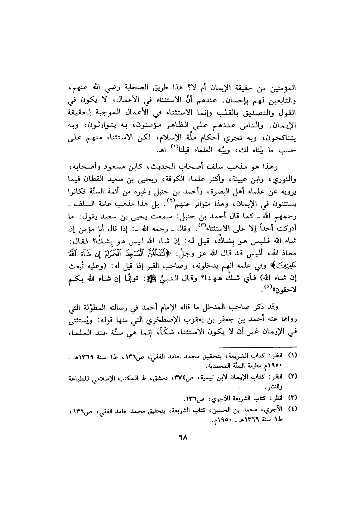 المؤمنين من حقيقة الإيمان أم لا؟ هذا طريق الصحابة رضي الله عنهم والتابعين لهم بإحسان. عندهم أن الاستثناء في الأعمال، لا يكون في القول والتصديق بالقلب وإنما الاستثناء في الأعمال الموجبة لحقيقة الإيمان. والناس عندهم على الظاهر مؤمنون، به يتوارثون، وبه يتناكحون، وبه تجري أحكام ملة الإسلام، لكن الاستثناء منهم على حسب ما بيَّناه لك، وبيَّنه العلماء قبلنا " 1اهـ.