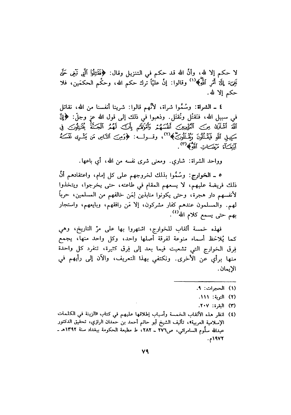4 ـ الشراة: وسموا شراة، لأنهم قالوا: شرينا أنفسنا من الله، نقاتل في سبيل الله، فنَقتُل ونُقتَل. وذهبوا في ذلك إلى قول الله عز وجل: {إِنَّ اللَّهَ اشْتَرَى مِنَ الْمُؤْمِنِينَ أَنْفُسَهُمْ وَأَمْوَالَهُمْ بِأَنَّ لَهُمُ الْجَنَّةَ يُقَاتِلُونَ فِي سَبِيلِ اللَّهِ فَيَقْتُلُونَ وَيُقْتَلُونَ} ، وقوله: {وَمِنَ النَّاسِ مَنْ يَشْرِي نَفْسَهُ ابْتِغَاءَ مَرْضَاتِ اللَّهِ} .