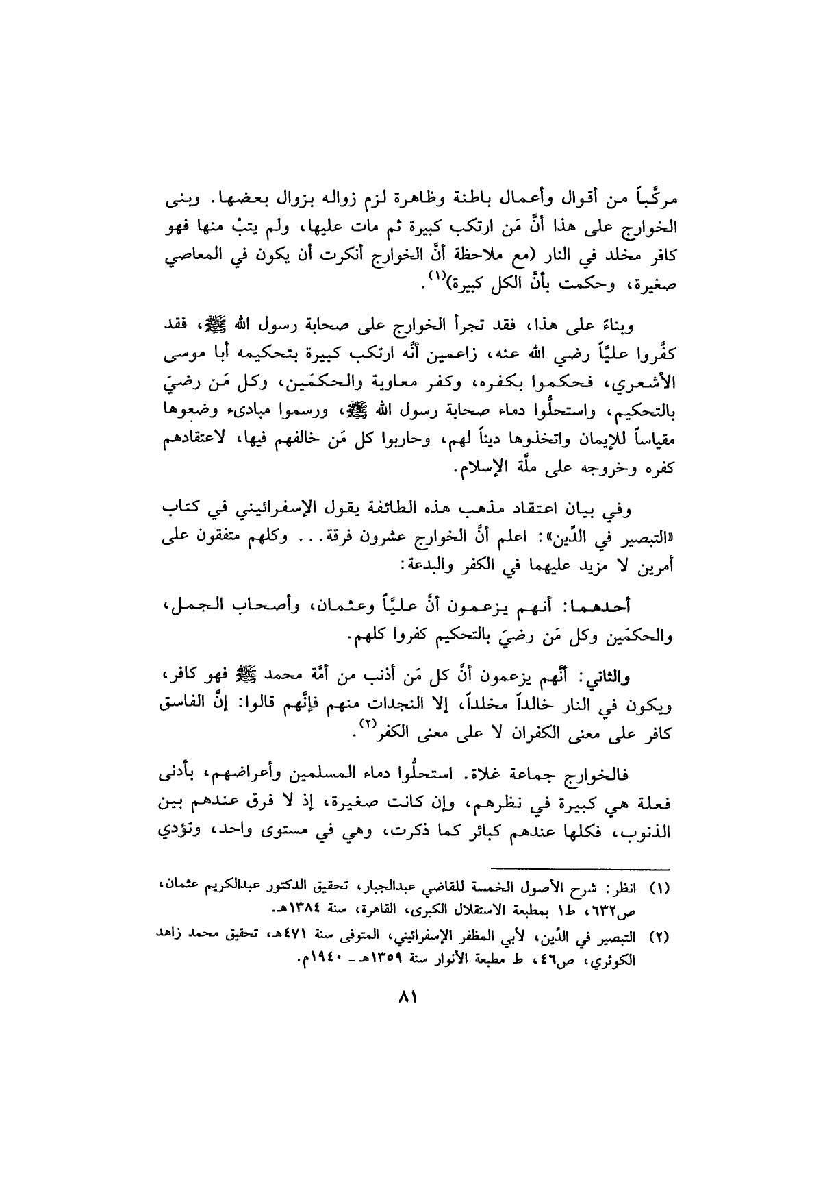 2 التبصير في الدين، لأبي المظفر الإسفرائيني، المتوفى سنة 471هـ، تحقيق محمد زاهد الكوثري، ص46، ط مطبعة الأنوار سنة 1359هـ ـ 1940م.