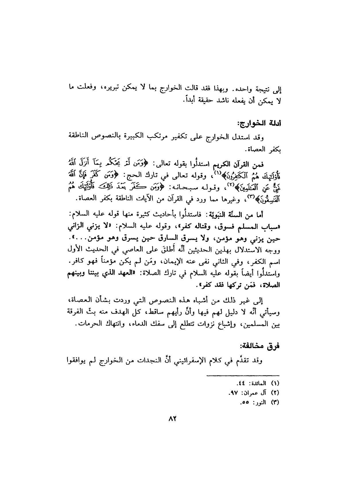 إلى غير ذلك من أشباه هذه النصوص التي وردت بشأن العصاة، وسيأتي أنه لا دليل لهم فيها وأن رأيهم ساقط، كل الهدف منه بثّ الفرقة بين المسلمين، وإشباع نزوات تتطلع إلى سفك الدماء، وانتهاك الحرمات.