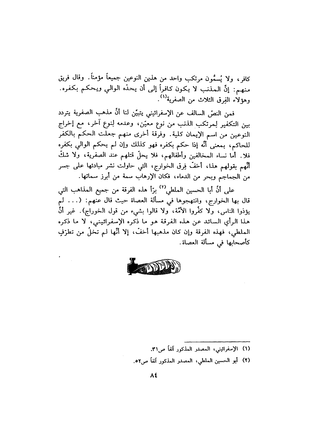 كافر، ولا يُسمُّون مرتكب واحد من هذين النوعين جميعاً مؤمناً. وقال فريق منهم: إن المذنب لا يكون كافراً إلى أن يحده الوالي ويحكم بكفره. وهؤلاء الفرق الثلاث من الصفرية.
