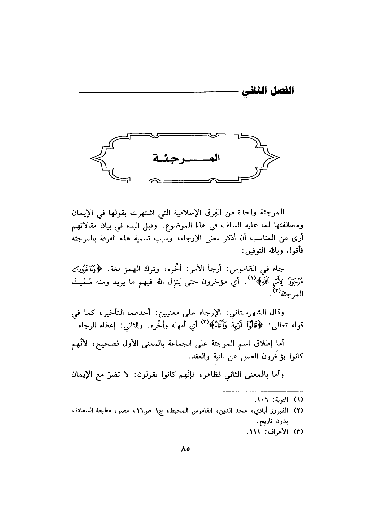 وقال الشهرستاني: الإرجاء على معنيين: أحدهما التأخير، كما في قوله تعالى: {قَالُوا أَرْجِهْ وَأَخَاهُ} 3 أي أمهله وأخِّره. والثاني: إعطاء الرجاء.