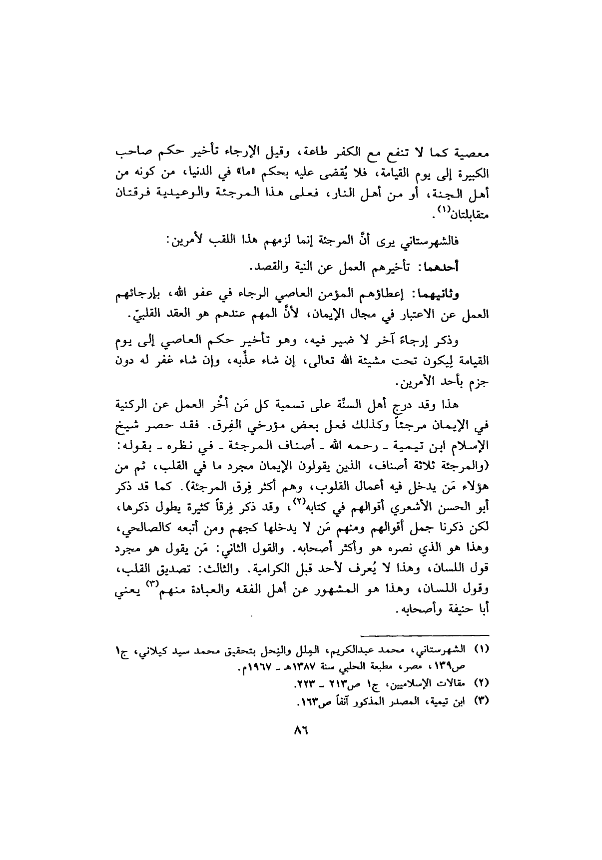 1 الشهرستاني، محمد عبد الكريم، الملل والنحل بتحقيق محمد سيد كيلاني، ج1 ص139، مصر، مطبعة الحلبي سنة 1387هـ ـ 1967م.