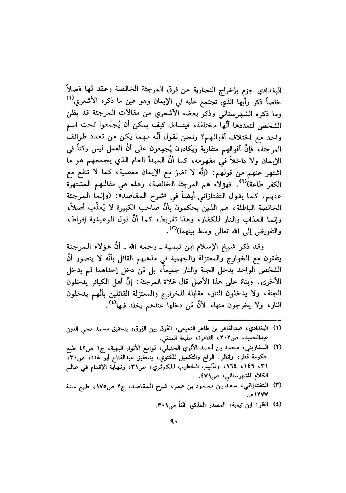 البغدادي جزم بإخراج النجارية عن فرق المرجئة الخالصة وعقد لها فصلاً خاصاً ذكر رأيها الذي تجتمع عليه في الإيمان وهو عين ما ذكره الأشعري1. وما ذكره الشهرستاني وذكر بعضه الأشعري من مقالات المرجئة قد يظن الشخص لتعددها أنها مختلفة، فيتساءل كيف يمكن أن يُجمَعوا تحت اسم واحد مع اختلاف أقوالهم؟ ونحن نقول أنه مهما يكن من تعدد طوائف المرجئة، فإن أقوالهم متقاربة ويكادون يُجمِعون على أن العمل ليس ركناً في الإيمان ولا داخلاً في مفهومه، كما أن المبدأ العام الذي يجمعهم هو ما اشتهر عنهم من قولهم: " إنه لا تضر مع الإيمان معصية، كما لا تنفع مع الكفر طاعة " 2. فهؤلاء هم المرجئة الخالصة، وهذه هي مقالتهم المشتهرة عنهم، كما يقول التفتازاني أيضاً في ((شرح المقاصد)) : " وإنما المرجئة الخالصة الباطلة، هم الذين يحكمون بأن صاحب الكبيرة لا يُعذَّب أصلاً، وإنما العذاب والنار للكفار، وهذا تفريط، كما أن قول الوعيدية إفراط، والتفويض إلى الله تعالى وسط بينهما " 3.