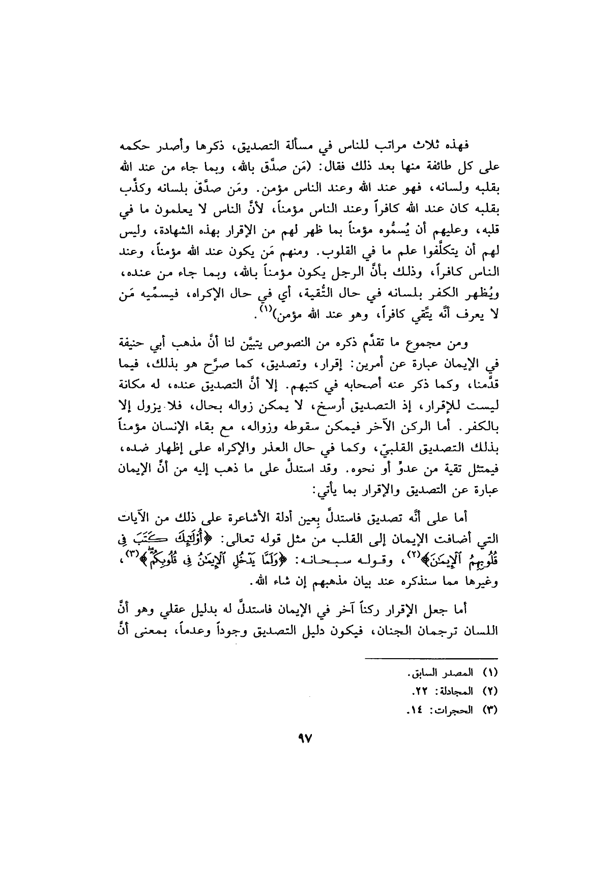 أما على أنه تصديق فاستدل بعين أدلة الأشاعرة على ذلك من الآيات التي أضافت الإيمان إلى القلب من مثل قوله تعالى: {أُولَئِكَ كَتَبَ فِي قُلُوبِهِمُ الْأِيمَانَ} 2، وقوله سبحانه: {وَلَمَّا يَدْخُلِ الْأِيمَانُ فِي قُلُوبِكُم} 3، وغيرها مما سنذكره عند بيان مذهبهم إن شاء الله.