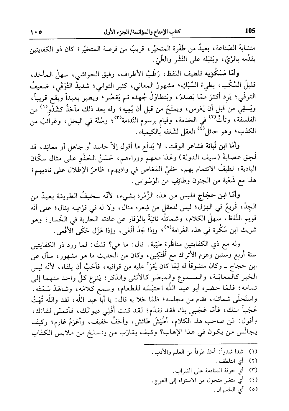 وأمّا مسكويه فلطيف اللفظ، رطب الأطراف، رقيق الحواشي، سهل المأخذ، قليل السّكب، بطيء السّبك، مشهور المعاني، كثير التواني، شديد التّوقّي، ضعيف الترقّي، يرد أكثر ممّا يصدر، ويتطاول جهده ثم يقصر، ويطير بعيدا ويقع قريبا، ويسقي من قبل أن يغرس، ويمتح من قبل أن يميه، وله بعد ذلك مآخذ كشدو «1» من الفلسفة، وتأتّ «2» في الخدمة، وقيام برسوم النّدامة «3» ، وسنّة في البخل، وغرائب من الكذب، وهو حائل «4» العقل لشغفه بالكيمياء.