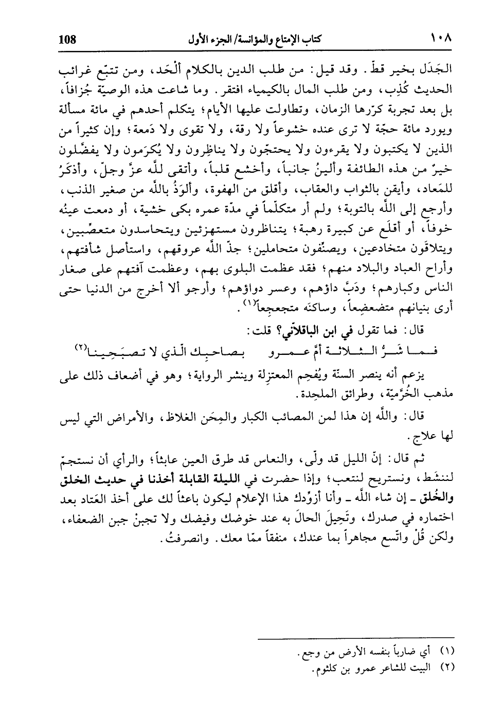 ثم قال: إنّ الليل قد ولّى، والنعاس قد طرق العين عابثا، والرأي أن نستجمّ لننشط، ونستريح لنتعب، وإذا حضرت في الليلة القابلة أخذنا في حديث الخلق والخلق- إن شاء الله- وأنا أزوّدك هذا الإعلام ليكون باعثا لك على أخذ العتاد بعد اختماره في صدرك، وتحيل الحال به عند خوضك وفيضك ولا تجبن جبن الضعفاء، ولكن قل واتّسع مجاهرا بما عندك، منفقا ممّا معك. وانصرفت.