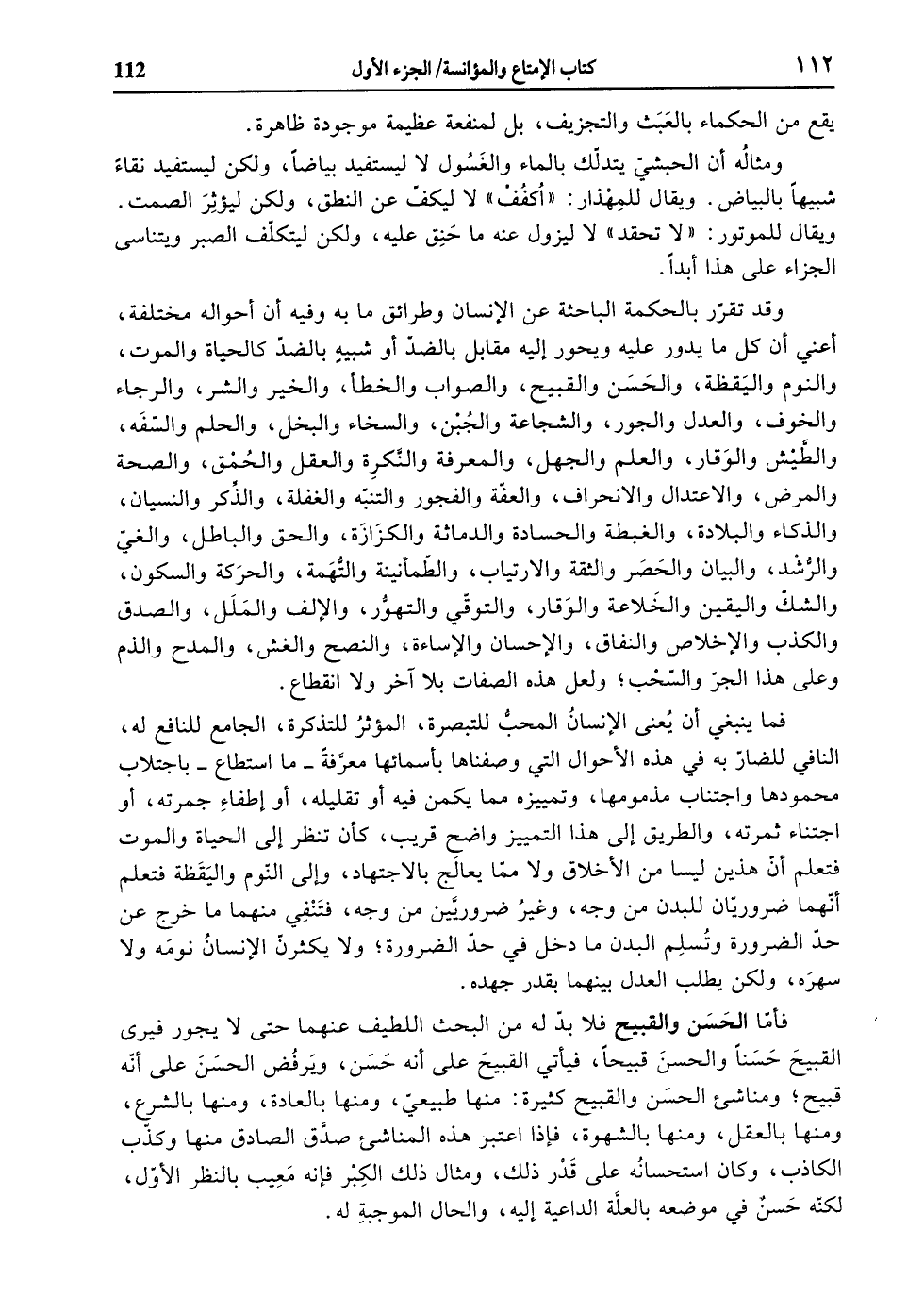 فما ينبغي أن يعنى الإنسان المحبّ للتبصرة، المؤثر للتذكرة، الجامع للنافع له، النافي للضارّ به في هذه الأحوال التي وصفناها بأسمائها معرّفة- ما استطاع- باجتلاب محمودها واجتناب مذمومها، وتمييزه مما يكمن فيه أو تقليله، أو إطفاء جمرته، أو اجتناء ثمرته، والطريق إلى هذا التمييز واضح قريب، كأن تنظر إلى الحياة والموت فتعلم أنّ هذين ليسا من الأخلاق ولا ممّا يعالج بالاجتهاد، وإلى النّوم واليقظة فتعلم أنّهما ضروريّان للبدن من وجه، وغير ضروريّين من وجه، فتنفي منهما ما خرج عن حدّ الضرورة وتسلم البدن ما دخل في حدّ الضرورة، ولا يكثرنّ الإنسان نومه ولا سهره، ولكن يطلب العدل بينهما بقدر جهده.