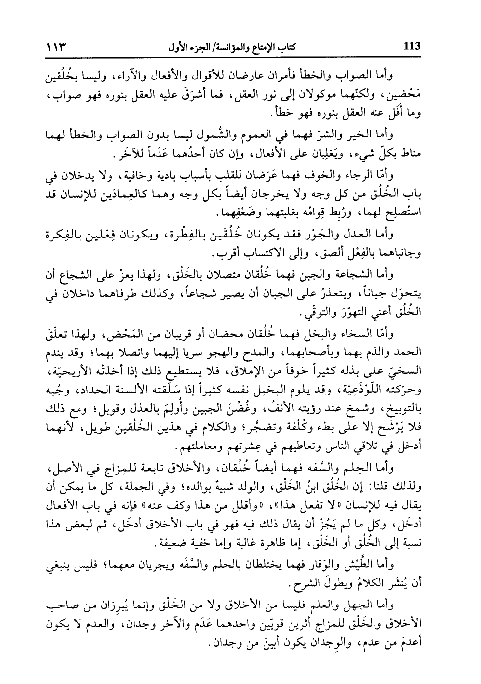 وأما الجهل والعلم فليسا من الأخلاق ولا من الخلق وإنما يبرزان من صاحب الأخلاق والخلق للمزاج أثرين قويّين واحدهما عدم والآخر وجدان، والعدم لا يكون أعدم من عدم، والوجدان يكون أبين من وجدان.