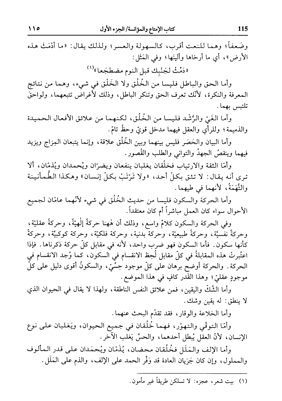 وفي الحركة والسكون كلام واسع، وذلك أن ههنا حركة إلهيّة، وحركة عقليّة، وحركة نفسيّة، وحركة طبيعيّة، وحركة بدنية، وحركة فلكيّة، وحركة كوكبيّة، وحركة كأنها سكون. فأما السكون فهو ضرب واحد، لأنه في مقابل كلّ حركة ذكرناها. فإذا اعتبرت هذه المقابلة في كلّ مقابل لحظ الانقسام في السكون، كما وجد الانقسام في الحركة. والحركة أوضح برهان على كلّ موجود حسّيّ، والسكون أقوى دليل على كلّ موجود عقليّ، وهذا القدر كاف في هذا الموضع.