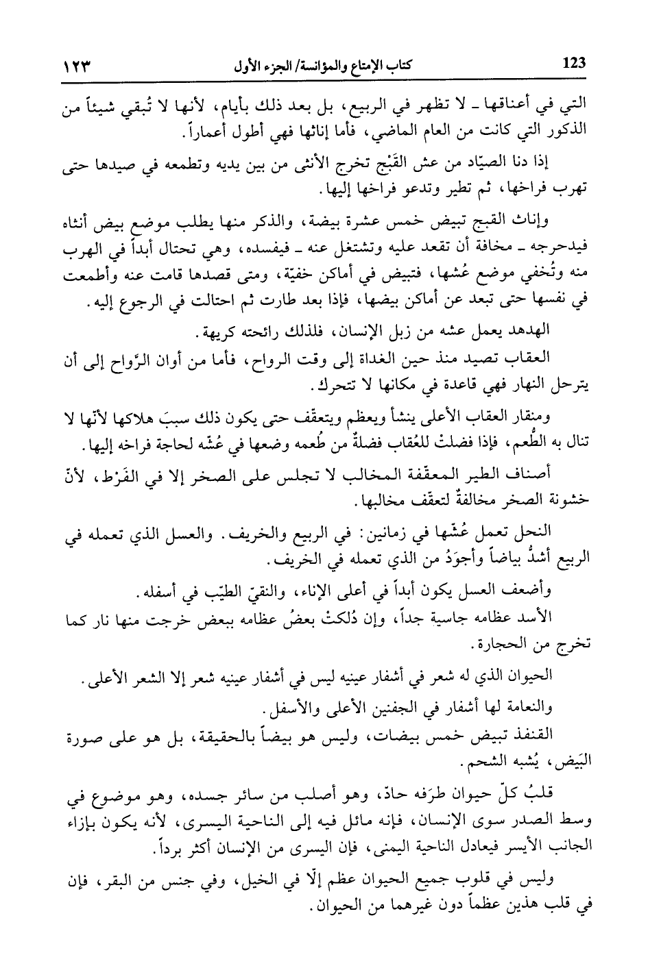 قلب كلّ حيوان طرفه حادّ، وهو أصلب من سائر جسده، وهو موضوع في وسط الصدر سوى الإنسان، فإنه مائل فيه إلى الناحية اليسرى، لأنه يكون بإزاء الجانب الأيسر فيعادل الناحية اليمنى، فإن اليسرى من الإنسان أكثر بردا.