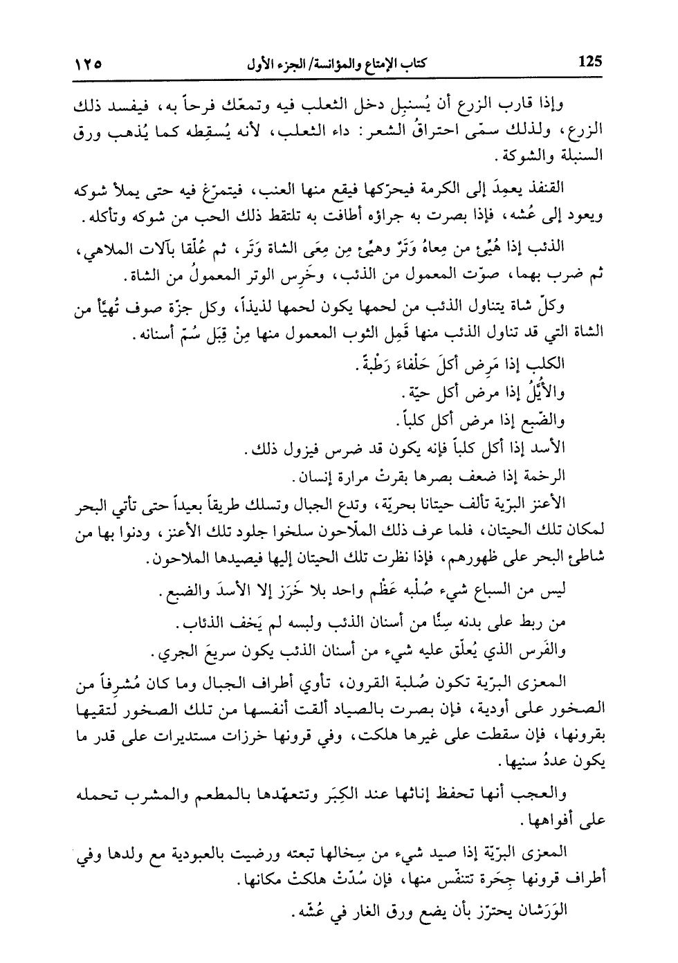 المعزى البرّية تكون صلبة القرون، تأوي أطراف الجبال وما كان مشرفا من الصخور على أودية، فإن بصرت بالصياد ألقت أنفسها من تلك الصخور لتقيها بقرونها، فإن سقطت على غيرها هلكت، وفي قرونها خرزات مستديرات على قدر ما يكون عدد سنيها.