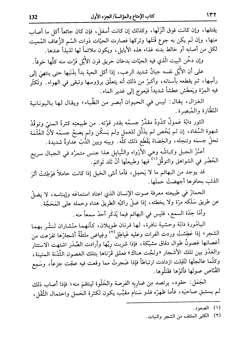 وغياض ملتفّة أشجارها تفرّعت من أغصانها غصون طوال دقاق مشبّكة، فإذا شربت ريّها وأرادت الصّدر اشتهت الاستتار والعدو بين تلك الأشجار «ولجّت هناك» فعلق قرناها بتلك الغصون اللّدنة المتينة، وكلّما عالجتها لتفلت ازدادت ارتباطا فإذا ضجرت مما وقعت فيه عجّت جزعا، وسمع القنّاص صوتها فأتوها فقتلوها.
