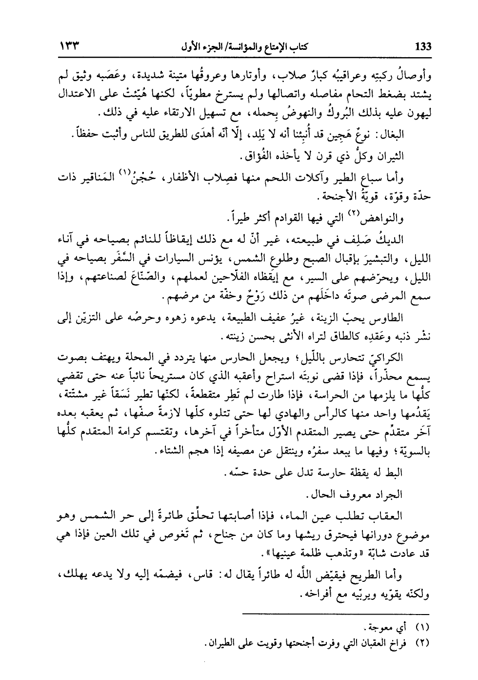 الكراكيّ تتحارس باللّيل، ويجعل الحارس منها يتردد في المحلة ويهتف بصوت يسمع محذّرا، فإذا قضى نوبته استراح وأعقبه الذي كان مستريحا نائبا عنه حتى تقضي كلّها ما يلزمها من الحراسة، فإذا طارت لم تطر متقطعة، لكنّها تطير نسقا غير مشتّتة، يقدمها واحد منها كالرأس والهادي لها حتى تتلوه كلّها لازمة صفّها، ثم يعقبه بعده آخر متقدّم حتى يصير المتقدم الأوّل متأخرا في آخرها، وتقتسم كرامة المتقدم كلّها بالسويّة، وفيها ما يبعد سفره وينتقل عن مصيفه إذا هجم الشتاء.