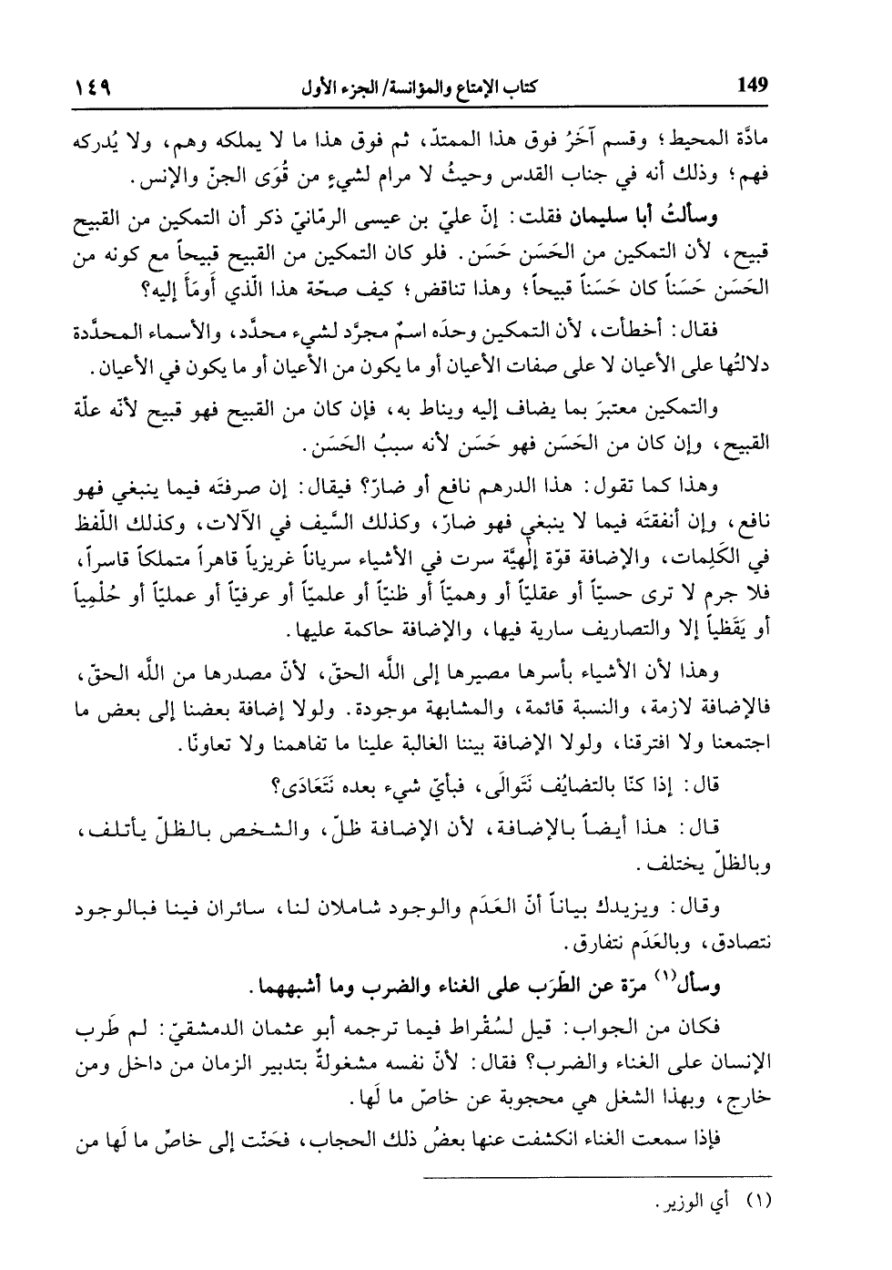وسألت أبا سليمان فقلت: إنّ عليّ بن عيسى الرمّانيّ ذكر أن التمكين من القبيح قبيح، لأن التمكين من الحسن حسن. فلو كان التمكين من القبيح قبيحا مع كونه من الحسن حسنا كان حسنا قبيحا، وهذا تناقض، كيف صحّة هذا الّذي أومأ إليه؟