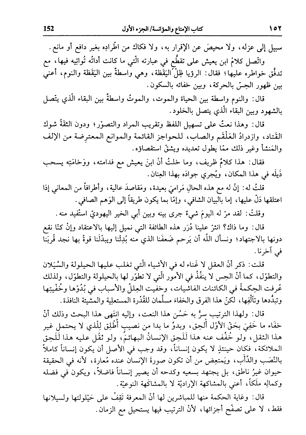واتّصل كلام ابن يعيش على تقطّع في عبارته الّتي ما كانت أداته تواتيه فيها، مع تدفّق خواطره عليها، فقال: الرؤيا ظلّ اليقظة، وهي واسطة بين اليقظة والنوم، أعني بين ظهور الحسّ بالحركة، وبين خفائه بالسكون.