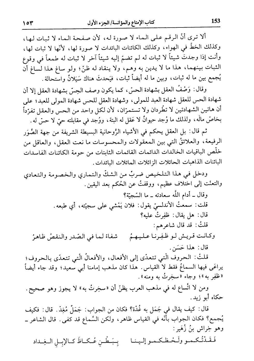 ثم قال: بل العقل يحكم في الأشياء الرّوحانية البسيطة الشريفة من جهة الصّور الرفيعة، والعلائق التي بين المعقولات والمحسوسات ما نعت العقل، والعاقل من خلّص الباقيات الخالدات الدائمات القائمات الثابتات من حومة الكائنات الفاسدات البائنات الذاهبات الحائلات الزائلات المائلات البائدات.