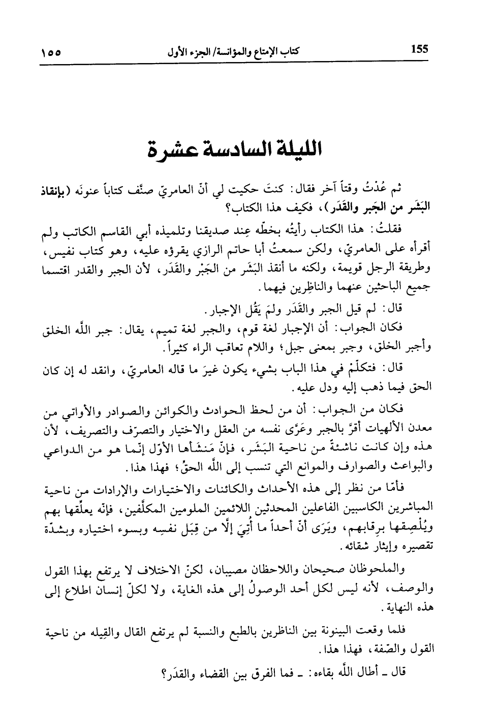 فقلت: هذا الكتاب رأيته بخطّه عند صديقنا وتلميذه أبي القاسم الكاتب ولم أقرأه على العامريّ، ولكن سمعت أبا حاتم الرازي يقرؤه عليه، وهو كتاب نفيس، وطريقة الرجل قويمة، ولكنه ما أنقذ البشر من الجبر والقدر، لأن الجبر والقدر اقتسما جميع الباحثين عنهما والناظرين فيهما.