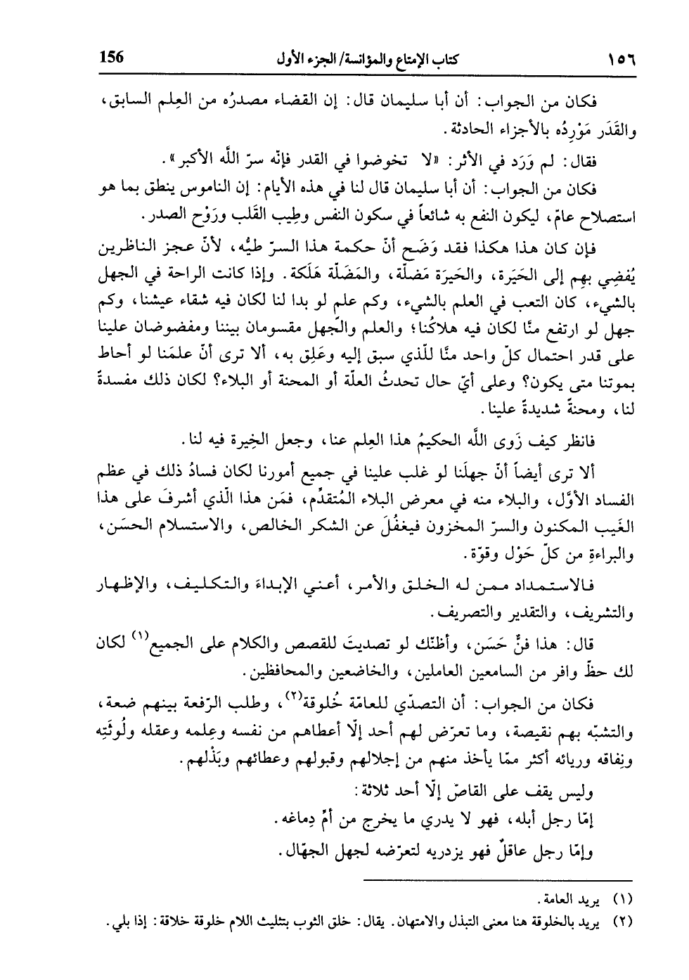 فكان من الجواب: أن التصدّي للعامّة خلوقة «2» ، وطلب الرّفعة بينهم ضعة، والتشبّه بهم نقيصة، وما تعرّض لهم أحد إلّا أعطاهم من نفسه وعلمه وعقله ولوثته ونفاقه وريائه أكثر ممّا يأخذ منهم من إجلالهم وقبولهم وعطائهم وبذلهم.