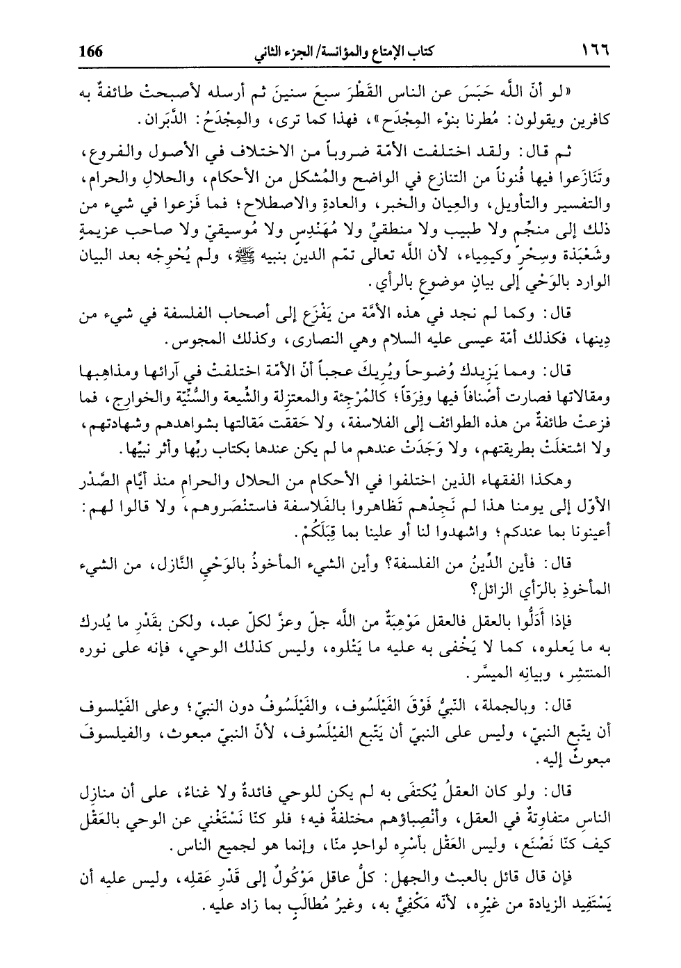 قال: ومما يزيدك وضوحا ويريك عجبا أنّ الأمّة اختلفت في آرائها ومذاهبها ومقالاتها فصارت أصنافا فيها وفرقا، كالمرجئة والمعتزلة والشّيعة والسّنّيّة والخوارج، فما فزعت طائفة من هذه الطوائف إلى الفلاسفة، ولا حققت مقالتها بشواهدهم وشهادتهم، ولا اشتغلت بطريقتهم، ولا وجدت عندهم ما لم يكن عندها بكتاب ربّها وأثر نبيّها.