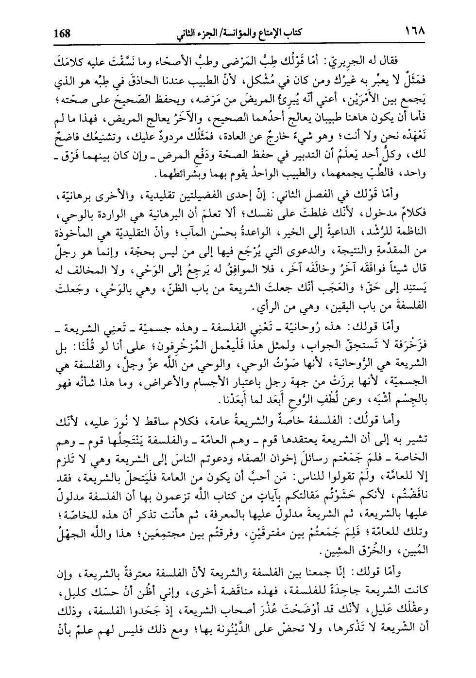 وأمّا قولك في الفصل الثاني: إنّ إحدى الفضيلتين تقليدية، والأخرى برهانيّة، فكلام مدخول، لأنّك غلطت على نفسك، ألا تعلم أن البرهانية هي الواردة بالوحي، الناظمة للرّشد، الداعية إلى الخير، الواعدة بحسن المآب، وأنّ التقليديّة هي المأخوذة من المقدّمة والنتيجة، والدعوى التي يرجع فيها إلى من ليس بحجّة، وإنما هو رجل قال شيئا فوافقه آخر وخالفه آخر، فلا الموافق له يرجع إلى الوحي، ولا المخالف له يستند إلى حقّ، والعجب أنّك جعلت الشريعة من باب الظنّ، وهي بالوحي، وجعلت الفلسفة من باب اليقين، وهي من الرأي.
