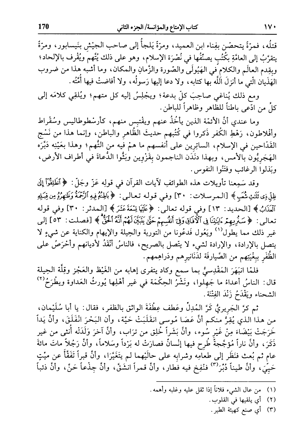 وما عندي أنّ الأئمّة الذين يأخذ عنهم ويقتبس منهم، كأرسطوطاليس وسقراط وأفلاطون، رهط الكفر ذكروا في كتبهم حديث الظّاهر والباطن، وإنما هذا من نسج القدّاحين في الإسلام، الساترين على أنفسهم ما هم فيه من التّهم، وهذا بعينه دبّره الهجريّون بالأمس، وبهذا دندن الناجمون بقزوين وبثّوا الدّعاة في أطراف الأرض، وبذلوا الرغائب وفتنوا النفوس.