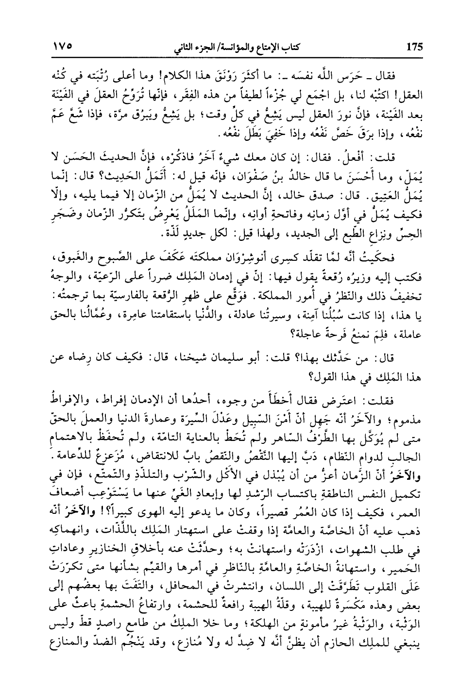 فقلت: اعترض فقال أخطأ من وجوه، أحدها أن الإدمان إفراط، والإفراط مذموم، والآخر أنّه جهل أنّ أمن السّبيل وعدل السّيرة وعمارة الدنيا والعمل بالحقّ متى لم يوكّل بها الطّرف السّاهر ولم تحط بالعناية التامّة، ولم تحفظ بالاهتمام الجالب لدوام النّظام، دبّ إليها النّقص والنّقض باب للانتقاض، مزعزع للدّعامة.