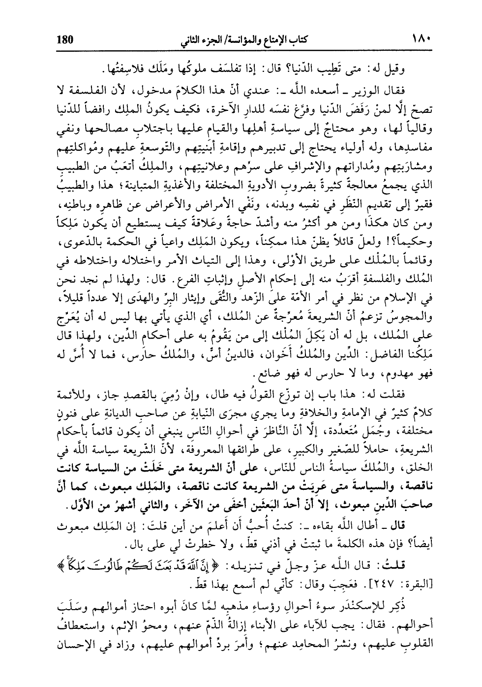 فقلت له: هذا باب إن توزّع القول فيه طال، وإن رمي بالقصد جاز، وللأئمة كلام كثير في الإمامة والخلافة وما يجري مجرى النّيابة عن صاحب الديانة على فنون مختلفة، وجمل متعدّدة، إلّا أنّ النّاظر في أحوال النّاس ينبغي أن يكون قائما بأحكام الشريعة، حاملا للصّغير والكبير، على طرائقها المعروفة، لأنّ الشّريعة سياسة الله في الخلق، والملك سياسة الناس للنّاس، على أنّ الشريعة متى خلت من السياسة كانت ناقصة، والسياسة متى عريت من الشريعة كانت ناقصة، والملك مبعوث، كما أنّ صاحب الدّين مبعوث، إلّا أنّ أحد البعثين أخفى من الآخر، والثاني أشهر من الأوّل.