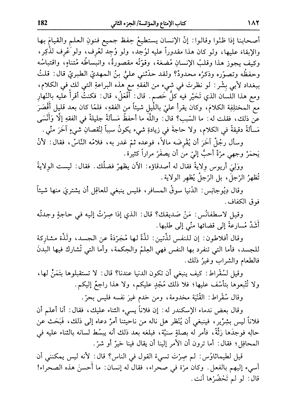 أصحابنا إذا ظنّوا وقالوا: إنّ الإنسان يستطيع حفظ جميع فنون العلم والقيام بها والإبقاء عليها، ولو كان هذا مقدورا عليه لوجد، ولو وجد لعرف، ولو عرف لذكر، وكيف يجوز هذا وقلب الإنسان مضغة، وقوّته مقصورة، وانبساطه متناه، واقتباسه وحفظه وتصوّره وذكره محدود؟ ولقد حدّثني عليّ بن المهديّ الطبريّ قال: قلت ببغداد لأبي بشر: لو نظرت في شيء من الفقه مع هذه البراعة التي لك في الكلام، ومع هذا اللسان الذي تحيّر فيه كلّ خصم. قال: أفعل، قال: فكنت أقرأ عليه بالنّهار مع المختلفة الكلام، وكان يقرأ عليّ باللّيل شيئا من الفقه، فلمّا كان بعد قليل أقصر عن ذلك، فقلت له: ما السّبب؟ قال: والله ما أحفظ مسألة جليلة في الفقه إلّا وأنسى مسألة دقيقة في الكلام، ولا حاجة في زيادة شيء يكون سببا لنقصان شيء آخر منّي.