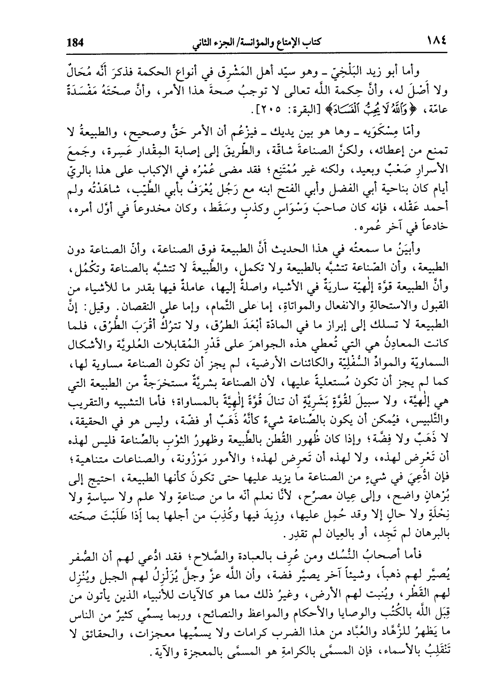وأبين ما سمعته في هذا الحديث أنّ الطبيعة فوق الصناعة، وأنّ الصناعة دون الطبيعة، وأن الصّناعة تتشبّه بالطبيعة ولا تكمل، والطّبيعة لا تتشبّه بالصناعة وتكمل، وأنّ الطبيعة قوّة إلهيّة سارية في الأشياء واصلة إليها، عاملة فيها بقدر ما للأشياء من القبول والاستحالة والانفعال والمواتاة، إما على التّمام، وإما على النقصان. وقيل: إنّ الطبيعة لا تسلك إلى إبراز ما في المادّة أبعد الطرق، ولا تترك أقرب الطّرق، فلما كانت المعادن هي التي تعطي هذه الجواهر على قدر المقابلات العلويّة والأشكال السماويّة والموادّ السّفليّة والكائنات الأرضية، لم يجز أن تكون الصناعة مساوية لها، كما لم يجز أن تكون مستعلية عليها، لأن الصناعة بشريّة مستخرجة من الطبيعة التي هي إلهيّة، ولا سبيل لقوّة بشريّة أن تنال قوّة إلهيّة بالمساواة، فأما التشبيه والتقريب والتّلبيس، فيمكن أن يكون بالصّناعة شيء كأنّه ذهب أو فضّة، وليس هو في الحقيقة، لا ذهب ولا فضّة، وإذا كان ظهور القطن بالطّبيعة وظهور الثوب بالصّناعة فليس لهذه أن تعرض لهذه، ولا لهذه أن تعرض لهذه، والأمور موزونة، والصناعات متناهية، فإن ادّعي في شيء من الصناعة ما يزيد عليها حتى تكون كأنها الطبيعة، احتيج إلى برهان واضح، وإلى عيان مصرّح، لأنّا نعلم أنّه ما من صناعة ولا علم ولا سياسة ولا نحلة ولا حال إلا وقد حمل عليها، وزيد فيها وكذب من أجلها بما إذا طلبت صحّته بالبرهان لم تجد، أو بالعيان لم تقدر.