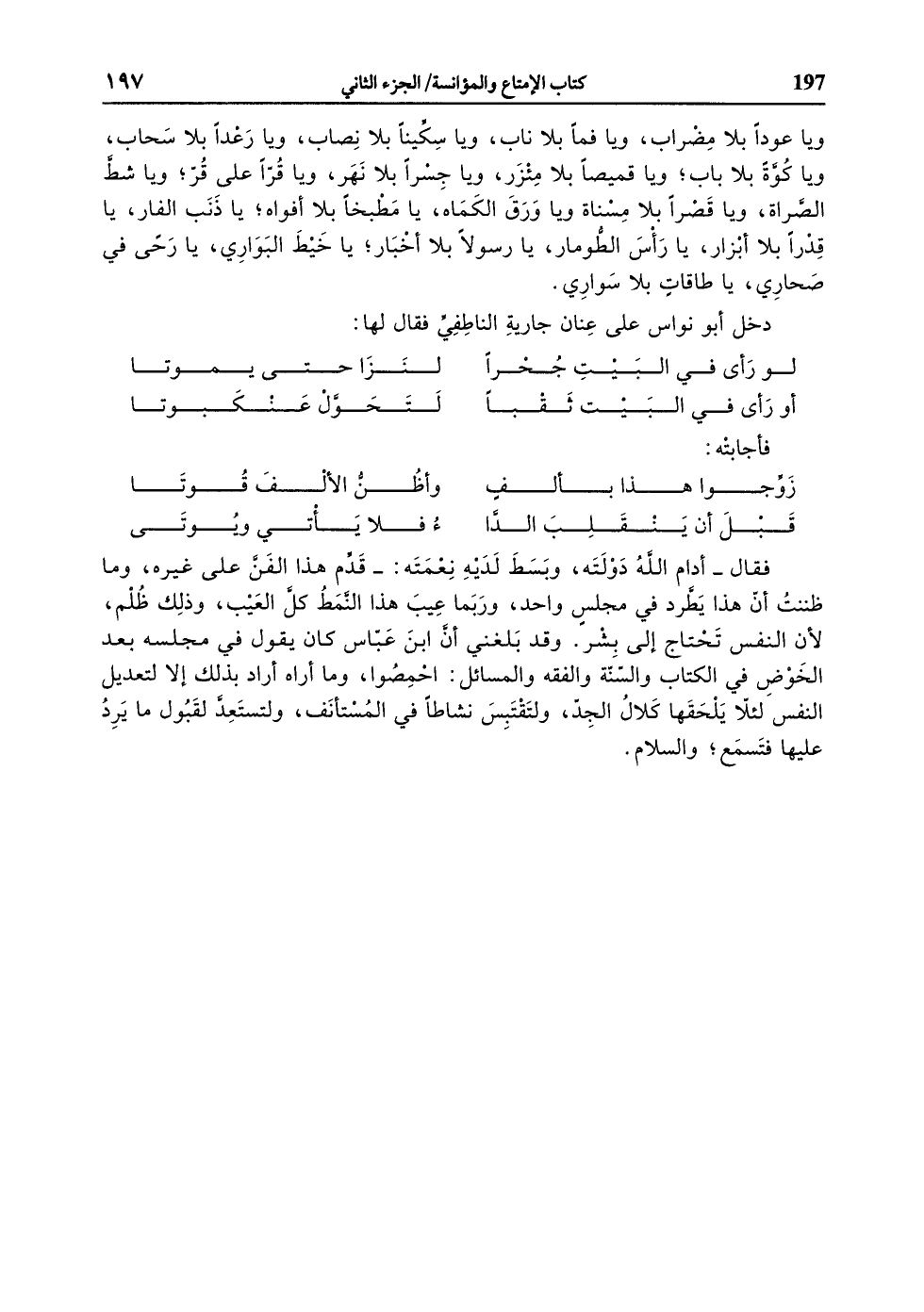 فقال- أدام الله دولته، وبسط لديه نعمته:- قدّم هذا الفنّ على غيره، وما ظننت أنّ هذا يطّرد في مجلس واحد، وربما عيب هذا النّمط كلّ العيب، وذلك ظلم، لأن النفس تحتاج إلى بشر. وقد بلغني أنّ ابن عبّاس كان يقول في مجلسه بعد الخوض في الكتاب والسّنّة والفقه والمسائل: احمصوا، وما أراه أراد بذلك إلا لتعديل النفس لئلّا يلحقها كلال الجدّ، ولتقتبس نشاطا في المستأنف، ولتستعدّ لقبول ما يرد عليها فتسمع، والسلام.