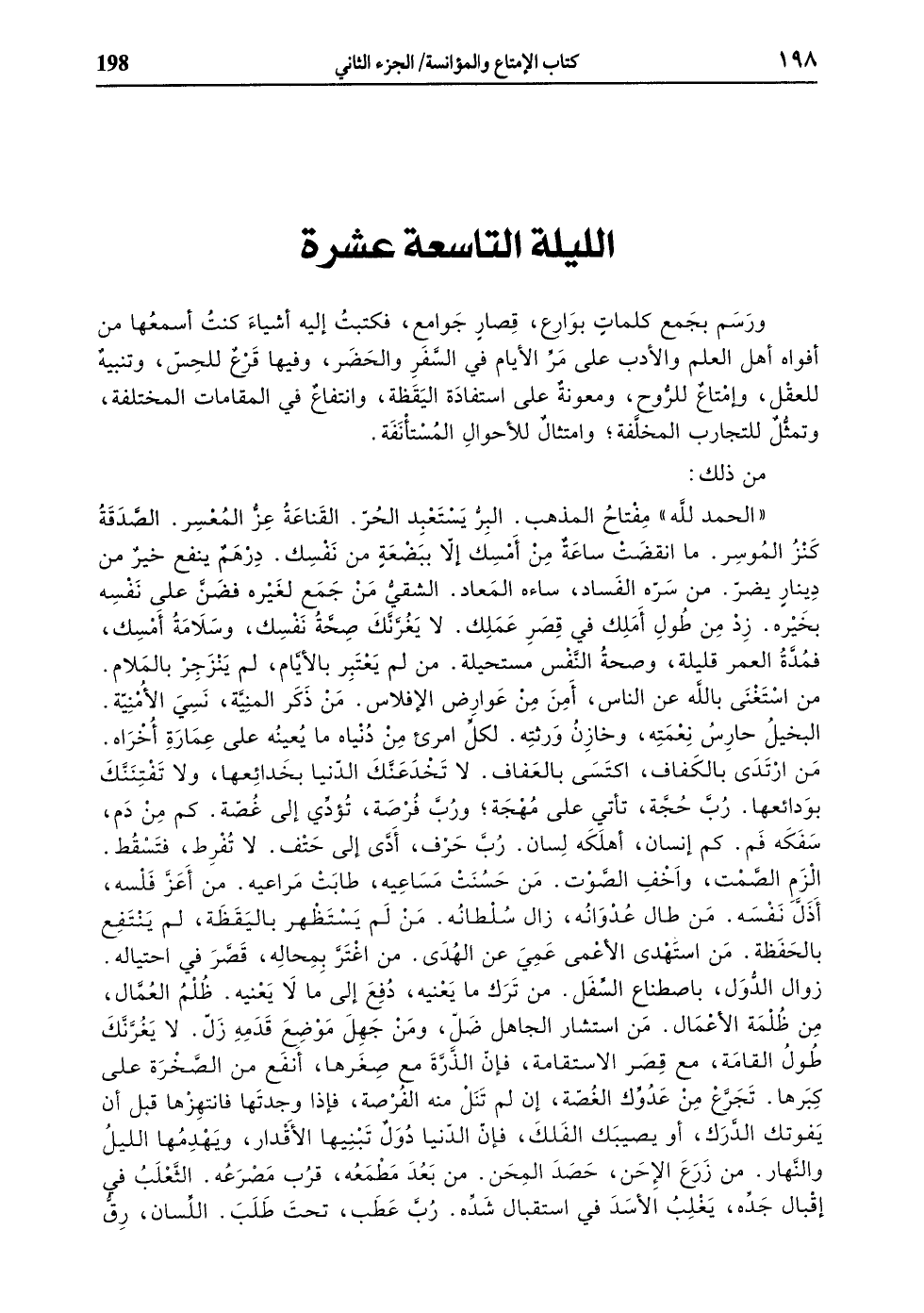 الزم الصّمت، واخف الصّوت. من حسنت مساعيه، طابت مراعيه. من أعزّ فلسه، أذلّ نفسه. من طال عدوانه، زال سلطانه. من لم يستظهر باليقظة، لم ينتفع بالحفظة. من استهدى الأعمى عمي عن الهدى. من اغترّ بمحاله، قصّر في احتياله.