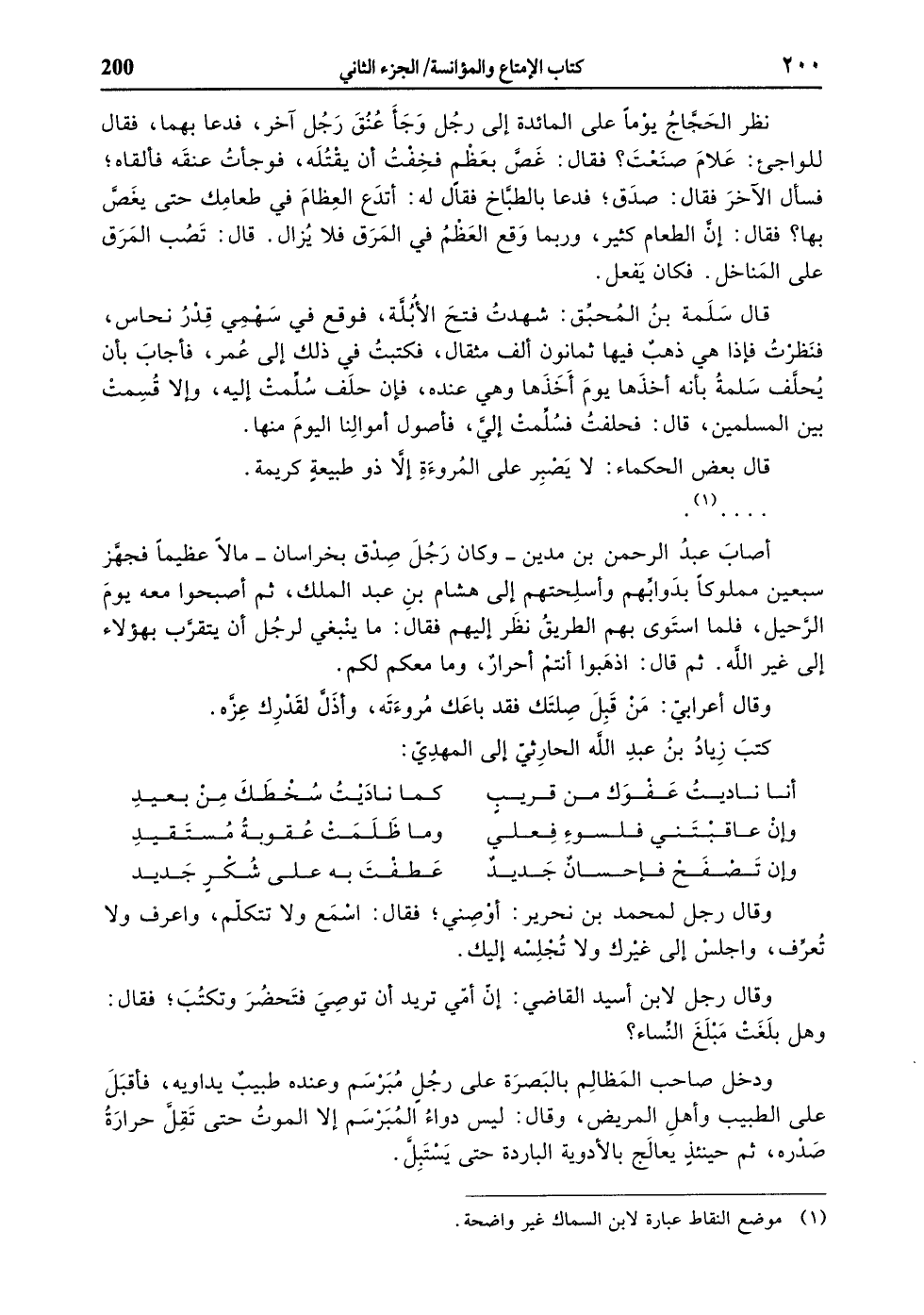 ودخل صاحب المظالم بالبصرة على رجل مبرسم وعنده طبيب يداويه، فأقبل على الطبيب وأهل المريض، وقال: ليس دواء المبرسم إلا الموت حتى تقلّ حرارة صدره، ثم حينئذ يعالج بالأدوية الباردة حتى يستبلّ.