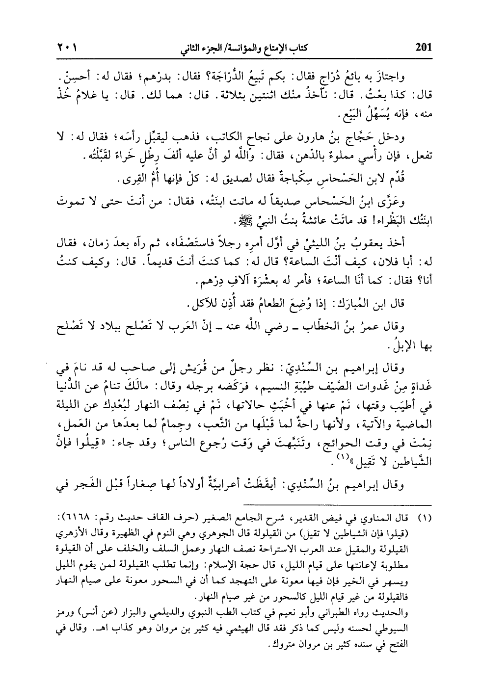 وقال إبراهيم بن السّنديّ: نظر رجل من قريش إلى صاحب له قد نام في غداة من غدوات الصّيف طيّبة النسيم، فركضه برجله وقال: مالك تنام عن الدّنيا في أطيب وقتها، نم عنها في أخبث حالاتها، نم في نصف النهار لبعدك عن الليلة الماضية والآتية، ولأنها راحة لما قبلها من التّعب، وجمام لما بعدها من العمل، نمت في وقت الحوائج، وتنبّهت في وقت رجوع الناس، وقد جاء: «قيلوا فإنّ الشّياطين لا تقيل» «1» .