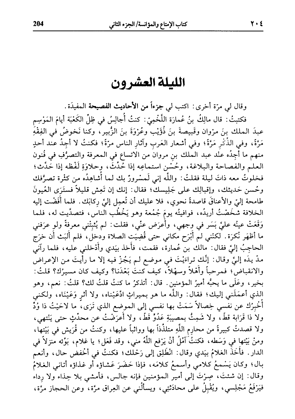 بخير، وعلى ما يحبّه أمير المؤمنين. قال: أتذكر ما كنت قلت لك؟ قلت: نعم، وهو الذي أعملني إليك، فقال: والله ما هو بميراث ادّعيناه، ولا أثر وعيناه، ولكني أخبرك عن نفسي خصالا سمت بها نفسي إلى الموضع الذي ترى، ما لاحيت ذا ودّ ولا ذا قرابة قطّ، ولا شمتّ بمصيبة عدوّ قطّ، ولا أعرضت عن محدّث حتى ينتهي، ولا قصدت كبيرة من محارم الله متلذّذا بها وواثبا عليها، وكنت من قريش في بيتها، ومن بيتها في وسطه، فكنت آمل أن يرفع الله مني، وقد فعل، يا غلام، بوّئه منزلا في الدار. فأخذ الغلام بيدي وقال: انطلق إلى رحلك، فكنت في أخفض حال، وأنعم بال، وكان يسمع كلامي وأسمع كلامه، فإذا حضر عشاؤه أو غذاؤه أتاني الغلام وقال: إن شئت، صرت إلى أمير المؤمنين فإنه جالس، فأمشي بلا حذاء ولا رداء فيرفع مجلسي، ويقبل على محادثتي، ويسألني عن العراق مرّة، وعن الحجاز مرّة،
