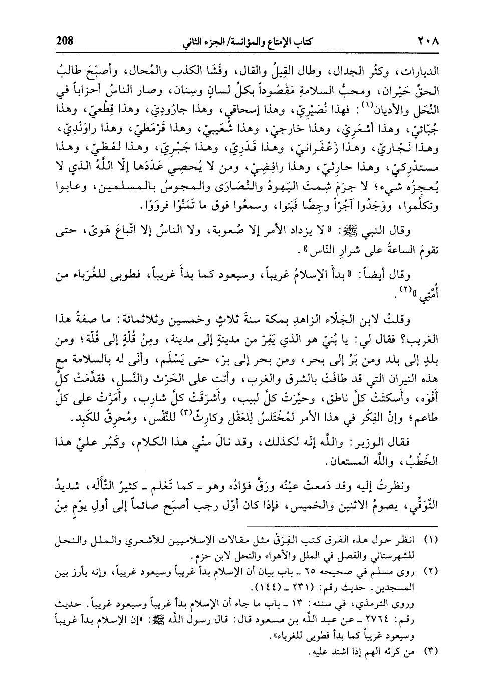 وقلت لابن الجلّاء الزاهد بمكة سنة ثلاث وخمسين وثلاثمائة: ما صفة هذا الغريب؟ فقال لي: يا بنيّ هو الذي يفرّ من مدينة إلى مدينة، ومن قلّة إلى قلّة، ومن بلد إلى بلد ومن برّ إلى بحر، ومن بحر إلى برّ، حتى يسلم، وأنّى له بالسلامة مع هذه النيران التي قد طافت بالشرق والغرب، وأتت على الحرث والنّسل، فقدّمت كلّ أفوه، وأسكتت كلّ ناطق، وحيّرت كلّ لبيب، وأشرقت كلّ شارب، وأمرّت على كلّ طاعم، وإنّ الفكر في هذا الأمر لمختلس للعقل وكارث «3» للنّفس، ومحرق للكبد.