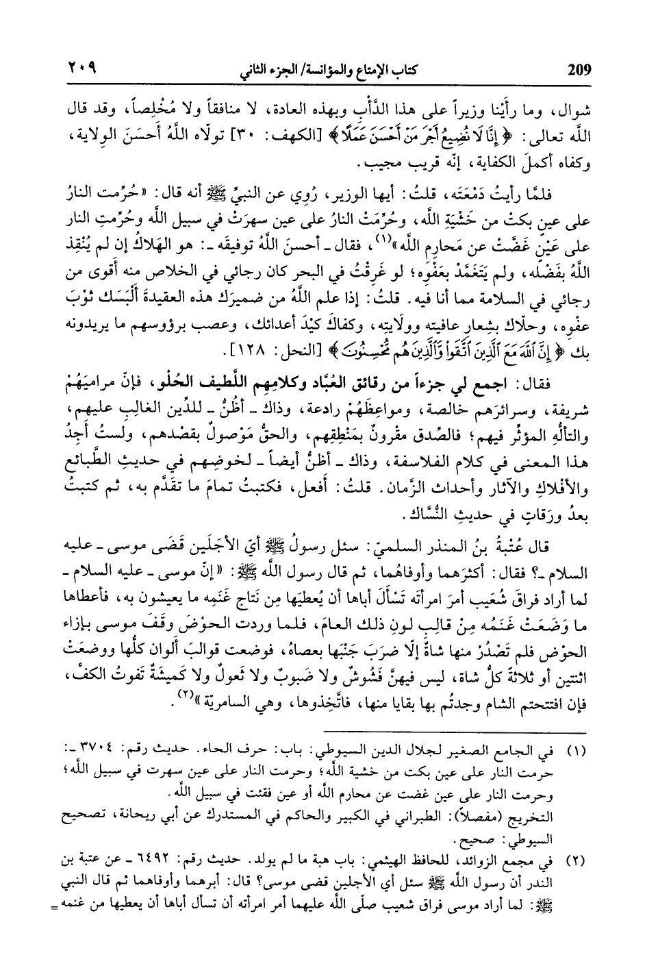 شوال، وما رأينا وزيرا على هذا الدّأب وبهذه العادة، لا منافقا ولا مخلصا، وقد قال الله تعالى: إِنَّا لا نُضِيعُ أَجْرَ مَنْ أَحْسَنَ عَمَلًا