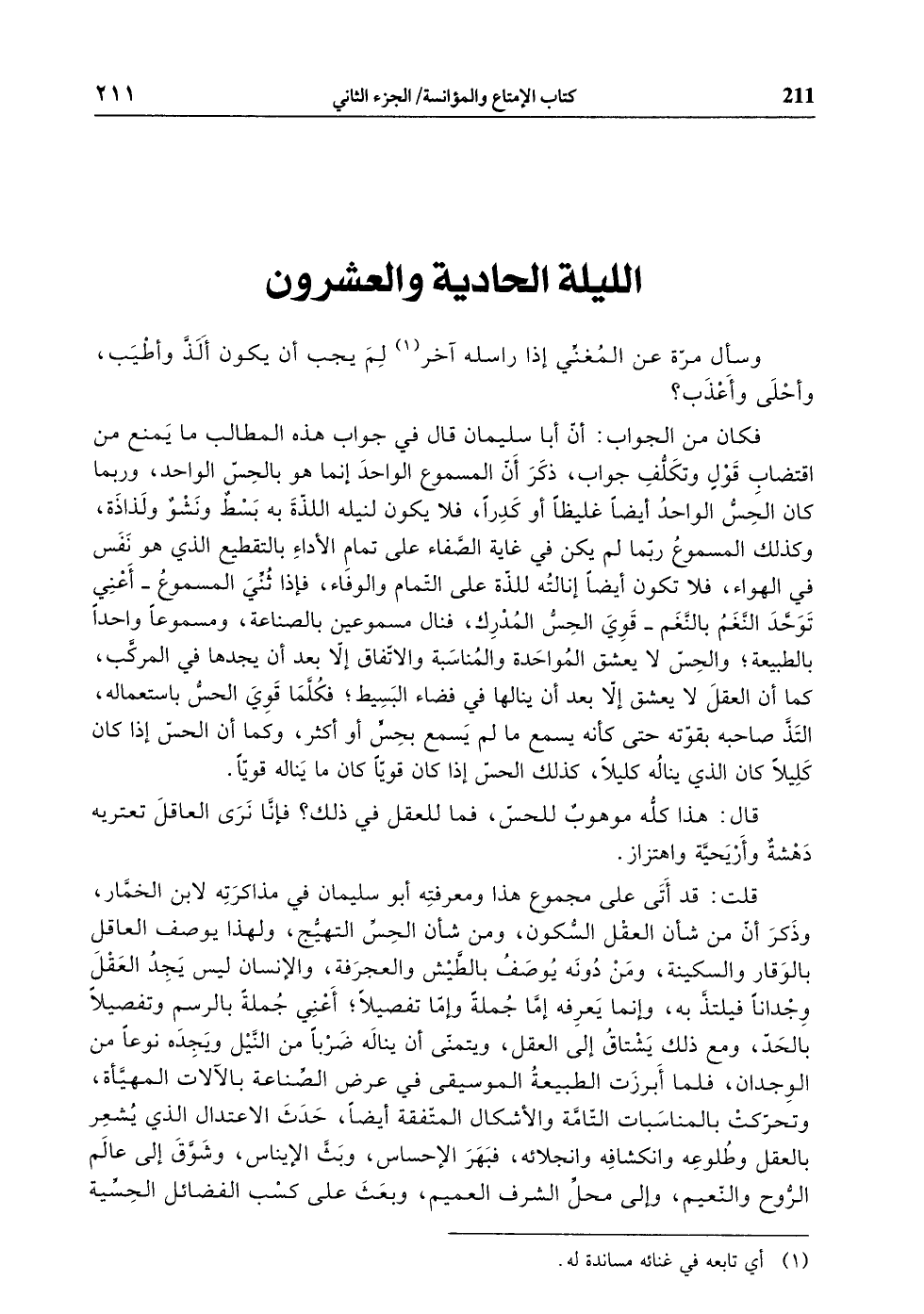 فكان من الجواب: أنّ أبا سليمان قال في جواب هذه المطالب ما يمنع من اقتضاب قول وتكلّف جواب، ذكر أنّ المسموع الواحد إنما هو بالحسّ الواحد، وربما كان الحسّ الواحد أيضا غليظا أو كدرا، فلا يكون لنيله اللذّة به بسط ونشو ولذاذة، وكذلك المسموع ربّما لم يكن في غاية الصّفاء على تمام الأداء بالتقطيع الذي هو نفس في الهواء، فلا تكون أيضا إنالته للذّة على التّمام والوفاء، فإذا ثنّي المسموع- أعني توحّد النّغم بالنّغم- قوي الحسّ المدرك، فنال مسموعين بالصناعة، ومسموعا واحدا بالطبيعة، والحسّ لا يعشق المواحدة والمناسبة والاتّفاق إلّا بعد أن يجدها في المركّب، كما أن العقل لا يعشق إلّا بعد أن ينالها في فضاء البسيط، فكلّما قويّ الحسّ باستعماله، التذّ صاحبه بقوّته حتى كأنه يسمع ما لم يسمع بحسّ أو أكثر، وكماأن الحسّ إذا كان كليلا كان الذي يناله كليلا، كذلك الحسّ إذا كان قويّا كان ما يناله قويّا.