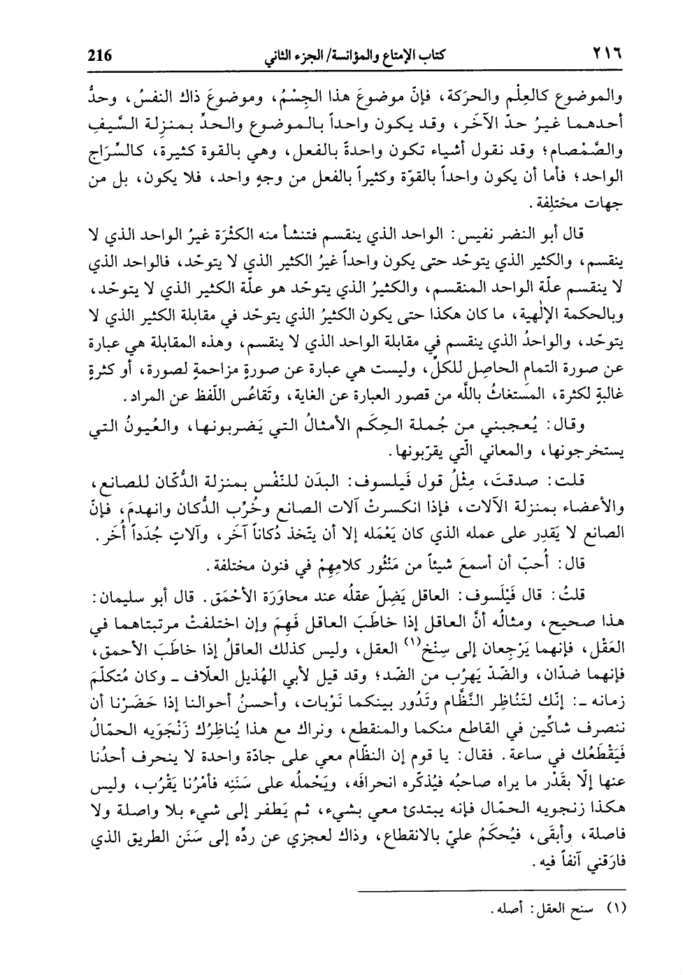 قال أبو النضر نفيس: الواحد الذي ينقسم فتنشأ منه الكثرة غير الواحد الذي لا ينقسم، والكثير الذي يتوحّد حتى يكون واحدا غير الكثير الذي لا يتوحّد، فالواحد الذي لا ينقسم علّة الواحد المنقسم، والكثير الذي يتوحّد هو علّة الكثير الذي لا يتوحّد، وبالحكمة الإلهية، ما كان هكذا حتى يكون الكثير الذي يتوحّد في مقابلة الكثير الذي لا يتوحّد، والواحد الذي ينقسم في مقابلة الواحد الذي لا ينقسم، وهذه المقابلة هي عبارة عن صورة التمام الحاصل للكلّ، وليست هي عبارة عن صورة مزاحمة لصورة، أو كثرة غالبة لكثرة، المستغاث بالله من قصور العبارة عن الغاية، وتقاعس اللّفظ عن المراد.