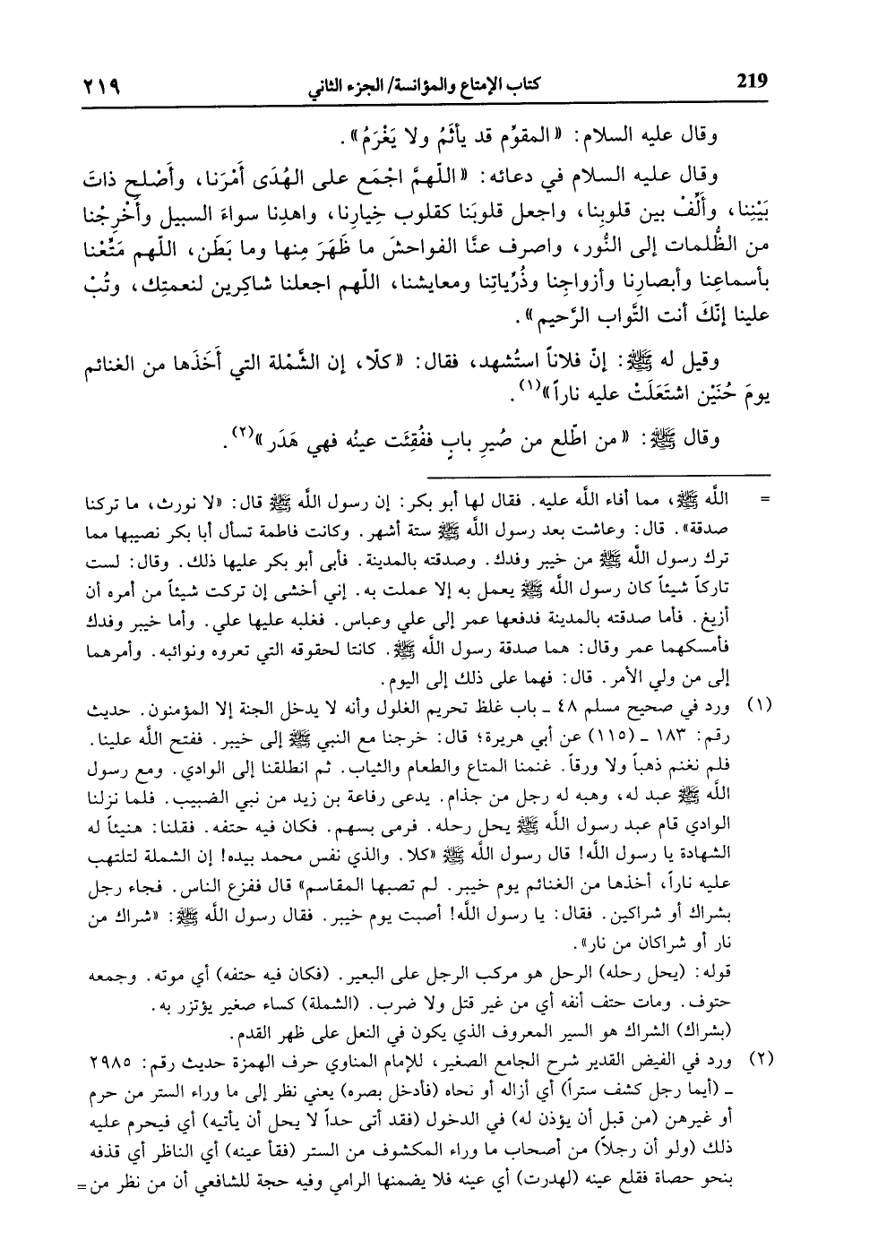 وقيل له صلّى الله عليه وسلّم: إنّ فلانا استشهد، فقال: «كلّا، إن الشّملة التي أخذها من الغنائم يوم حنين اشتعلت عليه نارا» «1» .