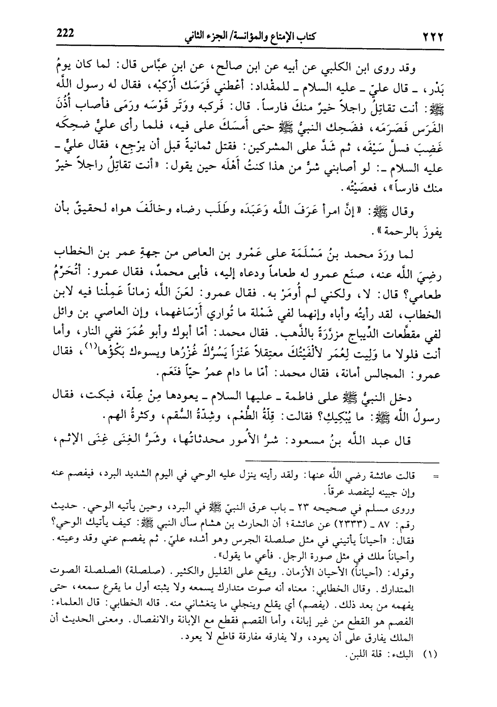 وقد روى ابن الكلبي عن أبيه عن ابن صالح، عن ابن عبّاس قال: لما كان يوم بدر،- قال عليّ- عليه السلام- للمقداد: أعطني فرسك أركبه، فقال له رسول الله صلّى الله عليه وسلّم: أنت تقاتل راجلا خير منك فارسا. قال: فركبه ووتر قوسه ورمى فأصاب أذن الفرس فصرمه، فضحك النبيّ صلّى الله عليه وسلّم حتى أمسك على فيه، فلمّا رأى عليّ ضحكه غضب فسلّ سيفه، ثم شدّ على المشركين: فقتل ثمانية قبل أن يرجع، فقال عليّ- عليه السلام-: لو أصابني شرّ من هذا كنت أهله حين يقول: «أنت تقاتل راجلا خير منك فارسا» ، فعصيته.