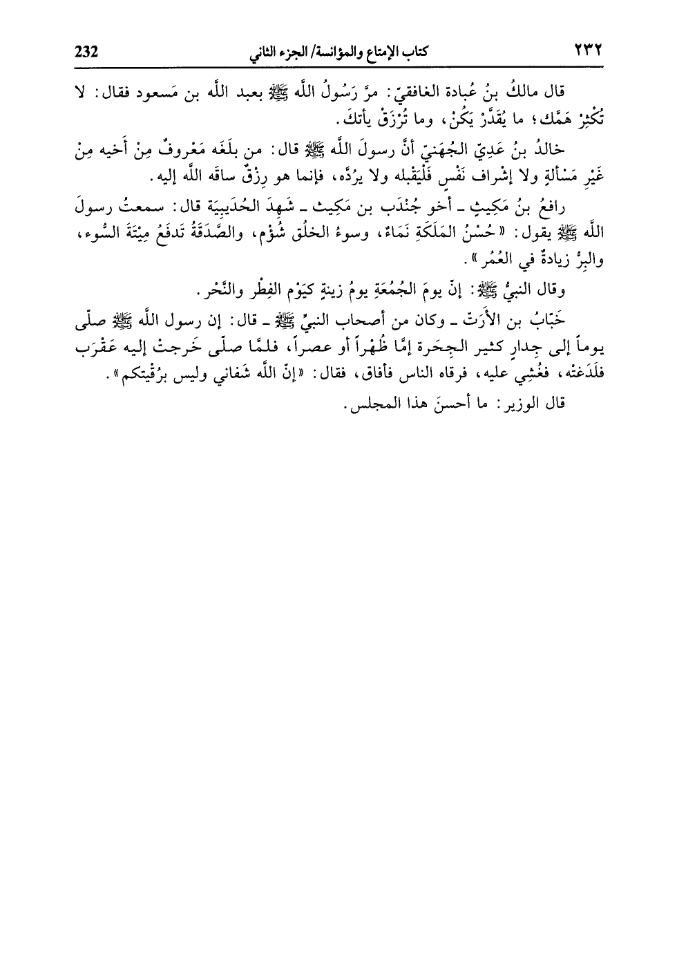 قال مالك بن عبادة الغافقيّ: مرّ رسول الله صلّى الله عليه وسلّم بعبد الله بن مسعود فقال: لا تكثر همّك، ما يقدّر يكن، وما ترزق يأتك.