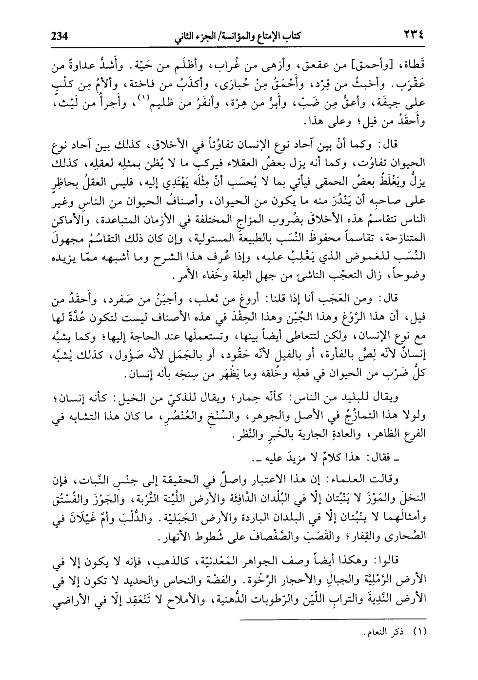 قال: وكما أنّ بين آحاد نوع الإنسان تفاوتا في الأخلاق، كذلك بين آحاد نوع الحيوان تفاوت، وكما أنه يزل بعض العقلاء فيركب ما لا يظن بمثله لعقله، كذلك يزلّ ويغلط بعض الحمقى فيأتي بما لا يحسب أنّ مثله يهتدي إليه، فليس العقل بحاظر على صاحبه أن يندر منه ما يكون من الحيوان، وأصناف الحيوان من الناس وغير الناس تتقاسم هذه الأخلاق بضروب المزاج المختلفة في الأزمان المتباعدة، والأماكن المتنازحة، تقاسما محفوظ النّسب بالطبيعة المستولية، وإن كان ذلك التقاسم مجهول النّسب للغموض الذي يغلب عليه، وإذا عرف هذا الشرح وما أشبهه ممّا يزيده وضوحا، زال التعجّب الناشئ من جهل العلة وخفاء الأمر.
