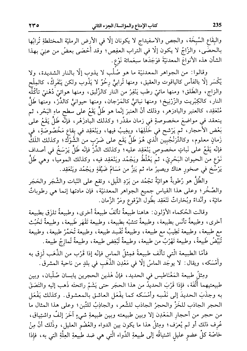 وقالوا: من الجواهر المعدنيّة ما هو صلب لا يذوب إلّا بالنار الشديدة، ولا يكسر إلّا بالفأس كالياقوت والعقيق، ومنها ترابيّ رخو لا يذوب ولكن ينفرك، كالملح والزاج، والطلق، ومنها مائيّ رطب ينفر من النار كالزّئبق، ومنها هوائيّ دهنيّ تأكله النار، كالكبريت والزّرنيخ، ومنها نباتيّ كالمرجان، ومنها حيوانيّ كالدّرّ، ومنها طلّ منعقد، كالعنبر والبادزهر، وذلك أنّ العنبر إنّما هو طلّ يقع على سطح ماء البحر، ثم ينعقد في مواضع مخصوصة في زمان مقدّر، وكذلك البادزهر، فإنّه طلّ يقع على بعض الأحجار، ثم يرشح في خللها، ويغيب فيها، وينعقد في بقاع مخصوصة، في زمان معلوم، وكالتّرنجبين الّذي هو طلّ يقع على ضرب من الشّوك، وكذلك اللك فإنّه يقع على نبات مخصوص ينعقد عليه، وكذلك الدّرّ فإنّه طلّ يرسخ في أصداف نوع من الحيوان البحريّ، ثم يغلط ويجمد وينعقد فيه، وكذلك الموميا، وهي طلّ يرسخ في صخور هناك ويصير ماء ثم ينزّ من مسامّ ضيّقة ويجمد وينعقد.