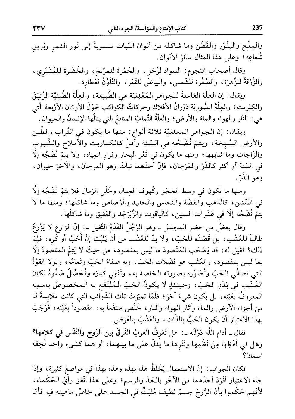 فكان الجواب: إنّ الاستعمال يخلط هذا بهذه وهذه بهذا في مواضع كثيرة، وإذا جاء الاعتبار أفرد أحدهما من الآخر بالحدّ والرسم، وعلى هذا اتّفق رأي الحكماء، لأنّهم حكموا بأنّ الرّوح جسم لطيف منبثّ في الجسد على خاصّ ماهيته فيه فأمّا