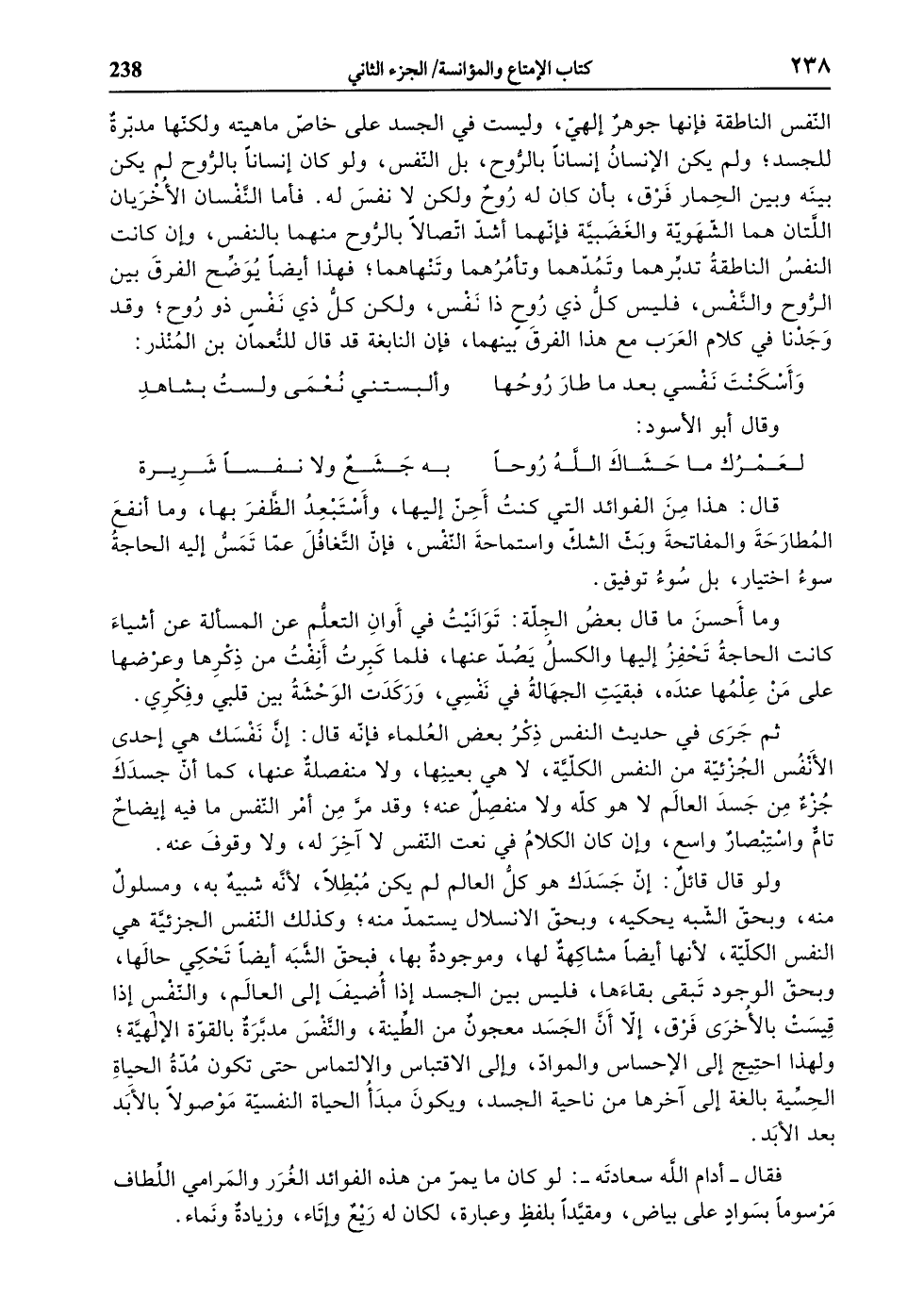 ولو قال قائل: إنّ جسدك هو كلّ العالم لم يكن مبطلا، لأنّه شبيه به، ومسلول منه، وبحقّ الشّبه يحكيه، وبحقّ الانسلال يستمدّ منه، وكذلك النّفس الجزئيّة هي النفس الكلّيّة، لأنها أيضا مشاكهة لها، وموجودة بها، فبحقّ الشّبه أيضا تحكي حالها، وبحقّ الوجود تبقى بقاءها، فليس بين الجسد إذا أضيف إلى العالم، والنّفس إذا قيست بالأخرى فرق، إلّا أنّ الجسد معجون من الطّينة، والنّفس مدبّرة بالقوّة الإلهيّة، ولهذا احتيج إلى الإحساس والموادّ، وإلى الاقتباس والالتماس حتى تكون مدّة الحياة الحسّية بالغة إلى آخرها من ناحية الجسد، ويكون مبدأ الحياة النفسيّة موصولا بالأبد بعد الأبد.