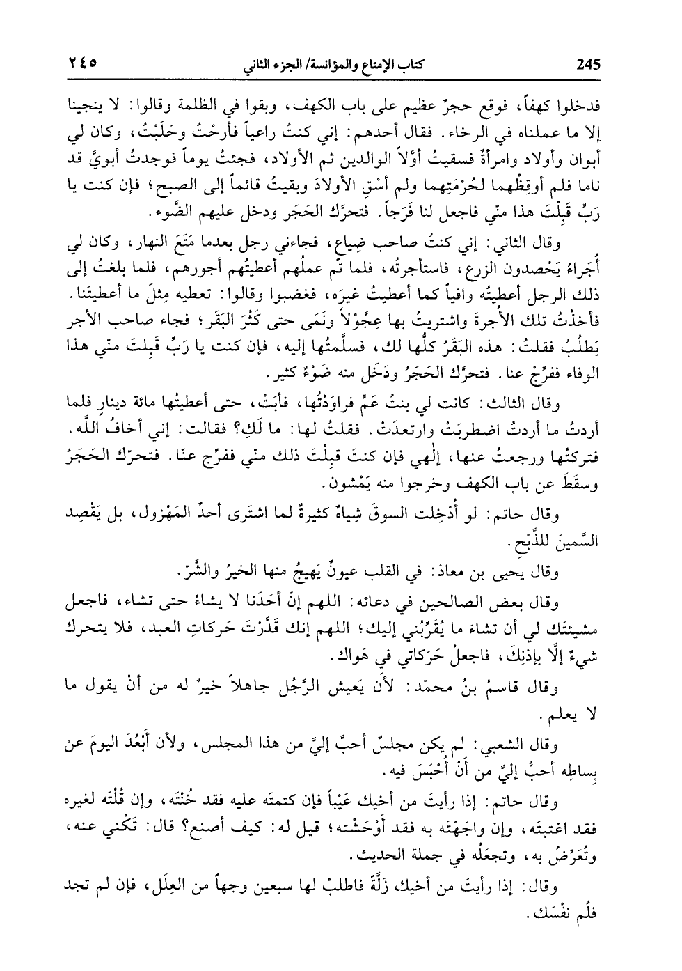 وقال الثاني: إني كنت صاحب ضياع، فجاءني رجل بعد ما متع النهار، وكان لي أجراء يحصدون الزرع، فاستأجرته، فلما تمّ عملهم أعطيتهم أجورهم، فلما بلغت إلى ذلك الرجل أعطيته وافيا كما أعطيت غيره، فغضبوا وقالوا: تعطيه مثل ما أعطيتنا.