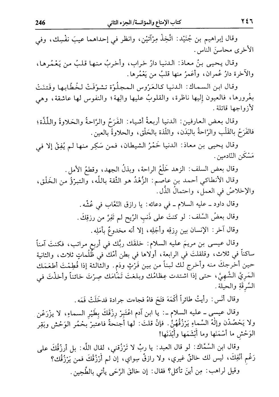 وقال عيسى- عليه السلام-: يا ابن آدم اعتبر رزقك بطير السماء، لا يزرعن ولا يحصدن وإله السّماء يرزقهنّ. فإن قلت: لها أجنحة فاعتبر بحمر الوحش وبقر الوحش ما أسمنها وما أبشمها وأبدنها! وقال ابن السّمّاك: لو قال العبد: يا ربّ لا ترزقني، لقال الله: بل أرزقك على رغم أنفك، ليس لك خالق غيري، ولا رازق سواي، إن لم أرزقك فمن يرزقك؟