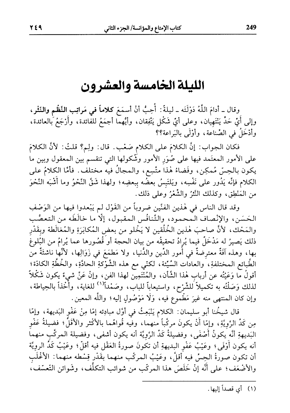 وقال- أدام الله دولته- ليلة: أحبّ أن أسمع كلاما في مراتب النّظم والنّثر، وإلى أيّ حدّ ينتهيان، وعلى أيّ شكل يتّفقان، وأيّهما أجمع للفائدة، وأرجع بالعائدة، وأدخل في الصّناعة، وأولى بالبراعة؟؟