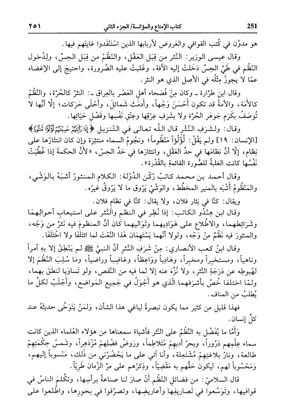 وقال: ولشرف النّثر قال الله تعالى في التّنزيل إِذا رَأَيْتَهُمْ حَسِبْتَهُمْ لُؤْلُؤاً مَنْثُوراً